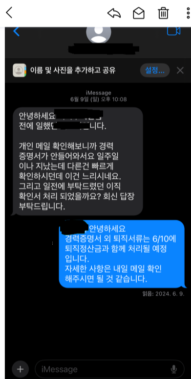 또한, 경영지원팀이 제가 요청한 경력증명서와 이직확인서 요청이 늦어져 주말에 늦게나마 문자로 보낸건 분명 실례가 맞지만, 다음날 메일로 박제하여 그게 인신공격이라는 어조로 저에게 비난을 한 것이 맞는가 싶습니다. 저는 이것 또한 직장 내 괴롭힘 이라고도 생각이 드는데 이것 또한 문제를 삼을 수 있는가 입니다.