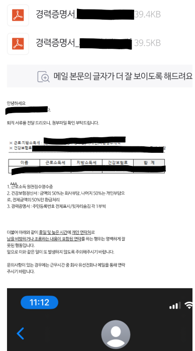 첨부파일은 일하였던 마지막 달 근로연봉계약서와 회신 메일과 박제된 메세지 입니다.
