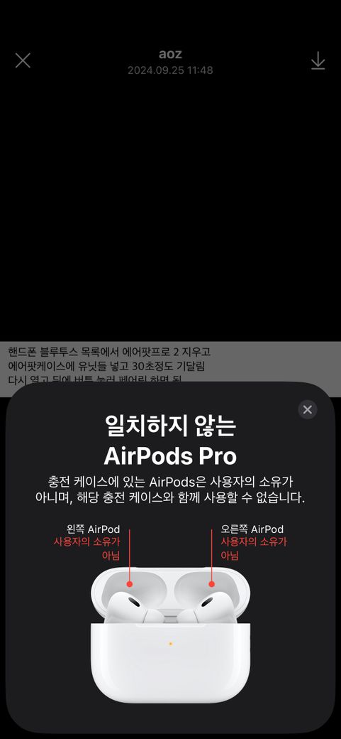 에어팟 프로 2 를 중고로 샀는데 자꾸 이 화면이 뜨면서 연결이 안됩니다. 상대방 나의 찾기에서 계정 연동도 끊었고 인터넷에 나와있는 초기화 방법도 하고있는데 다 안됩니다 ㅠㅠ 도와주세요