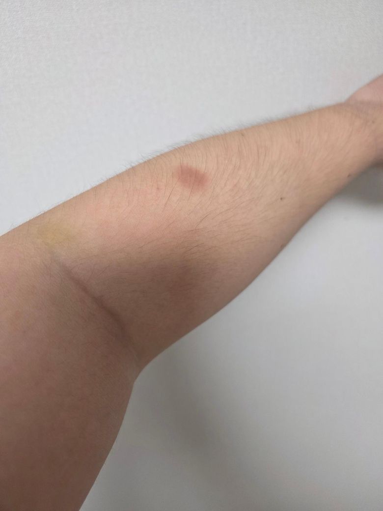 손목 통증때문에 맞았는데 오후에 보니 오십원 크기의 노란색 멍과 갈색 멍이 생겼습니다.