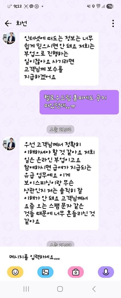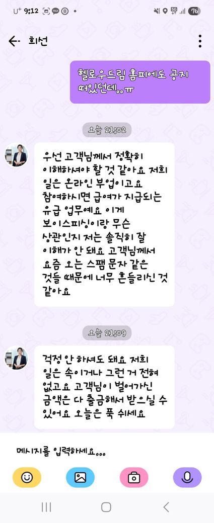 나머지 4만6천5백원은 앱으로 입금되어 제 통장으로 출금했는데 부업사이트에 들어가니 사칭 피해 공지가 되어있더라구요.그래서 매니저라는 분에게 메세지를 보냈는데 첨부한 사진 내용으로 왔네요