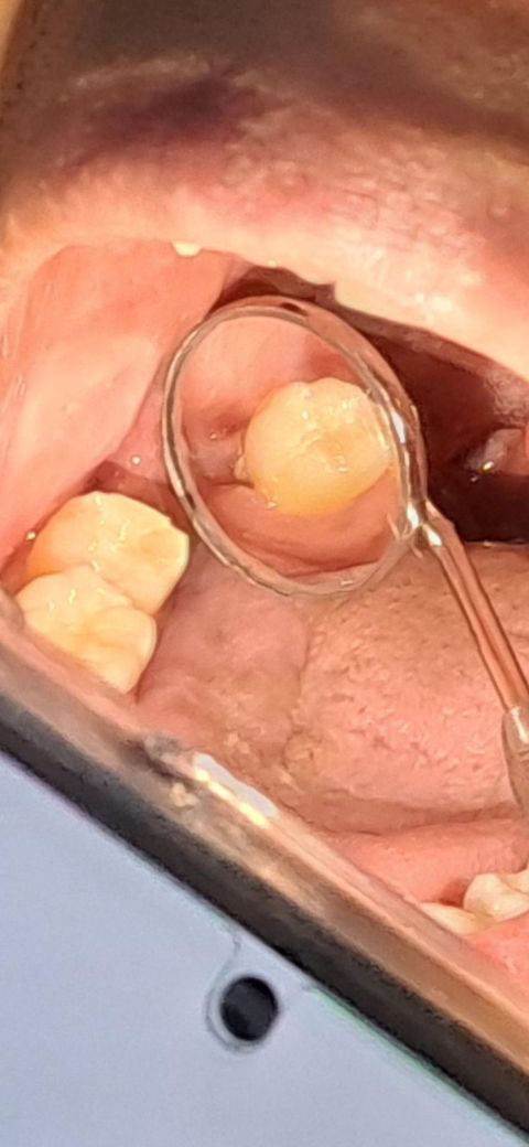 왼쪽 아래 사랑니를 발치하고 인접한 어금니에 충치가 있어 인레이 치료를 받고 3주 정도 지났는데요 해당 어금니 아래쪽 잇몸에 하얀색 무언가가 보여서 질문드립니다. 이부분이 특히 더 시린것 같습니다. 이게 뭘까요?