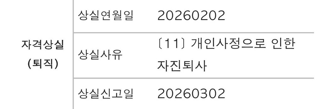 다만 확인해보니 고용보험 자격상실 신고 사유는 [11] 개인사정으로 인한 자진퇴사로 되어 있습니다.