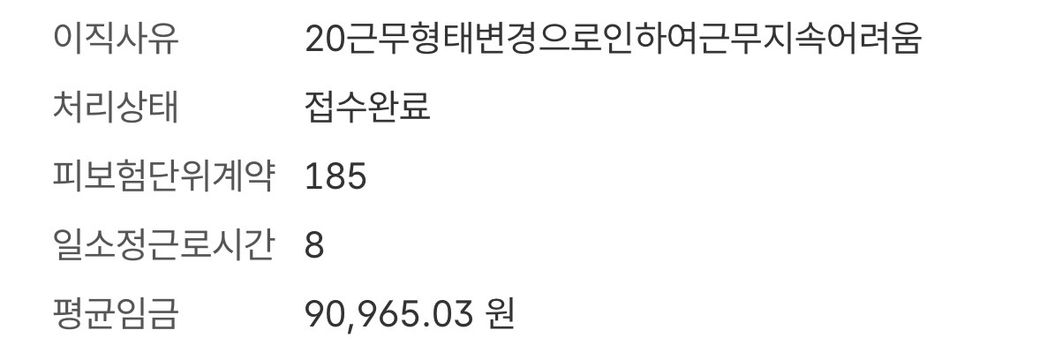회사에서도 **이직확인서 이직사유를 코드20(근무형태 변경으로 인한 근무 지속 어려움)**으로 제출했으며, 현재 고용보험 시스템에서 이직확인서 처리상태는 접수완료로 확인됩니다.