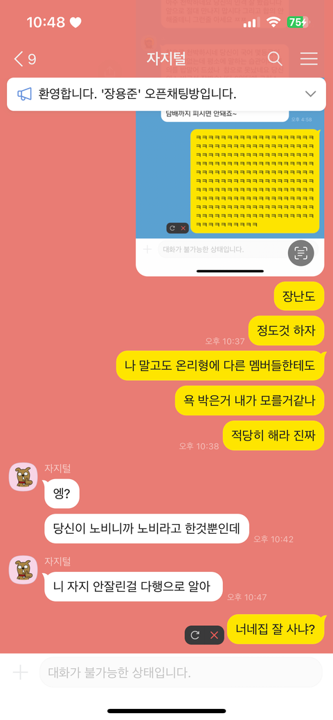한 카카오톡 오픈채팅방에서 알게 된 유저와 갈등이 있던 와중 제 카카오톡 오픈프로필 일대일 채팅에 들어와 니. 자x(남성의 성기) 안 잘린걸 다행으로 알아 라며 욕설을 하였는데 법적 처벌이 이루어질까요? 사진 첨부하겠습니다.