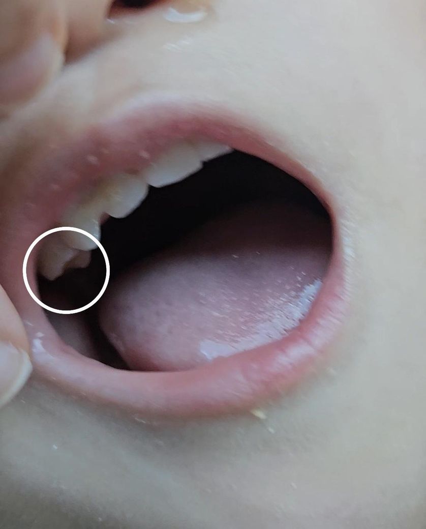크게 문제가 되는것으로 보이지는 않지만 걱정이 되신다면 치과에서 진료를 받아 보는것이 좋습니다.