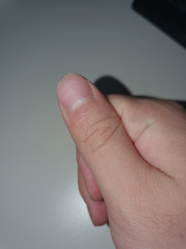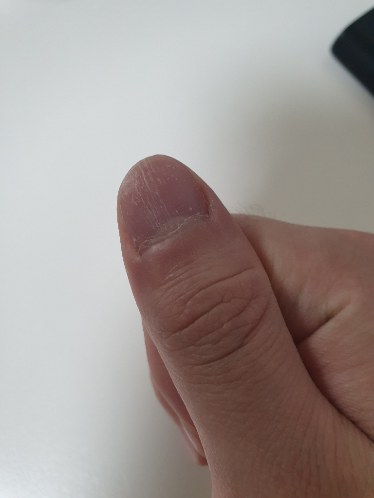 제공하신 사진을 보면, 엄지 손톱에 수직으로 선이 나타난 것을 볼 수 있습니다.