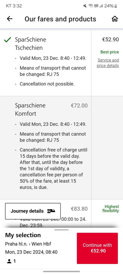 OBB에서 기차 표 예약 시 두 사람이 각각 따로 예약하는 것과 한 명이 두 명의 좌석을 함께 예약하는 것의 가격 차이는 다양한 요소에 따라 달라질 수 있습니다. 일반적으로 한 명이 두 명의 좌석을 예약하는 경우, 할인이나 프로모션을 적용받을 수 있어 더 저렴할 수 있지만, 특정 시점이나 열차에 따라 가격이 다를 수 있습니다. 각각 예약하면 개별적인 가격 옵션을 선택할 수 있어 더 유리할 수도 있고, 좌석 예약 상황에 따라 다르게 나타날 수 있습니다. 티켓마다 가격이 다른 이유는 각기 다른 서비스나 조건(예: 좌석 예약 여부, 기차 종류, 할인율 등)에 따라 달라지기 때문입니다. 예를 들어, 'Saver' 요금은 가격이 저렴하지만 변경 불가능하거나 제한적인 조건이 있을 수 있고, 'Flex' 요금은 유연한 예약 변경이 가능하지만 더 높은 가격을 책정하는 경우가 많습니다.