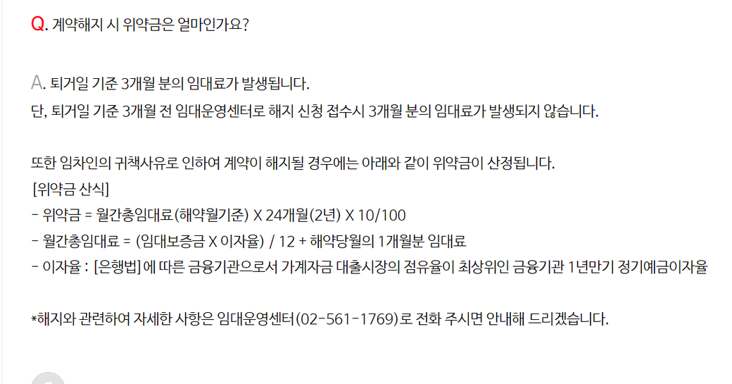 공공임대제일풍경채 계약해지시 위약금 계산 부탁드립니다.