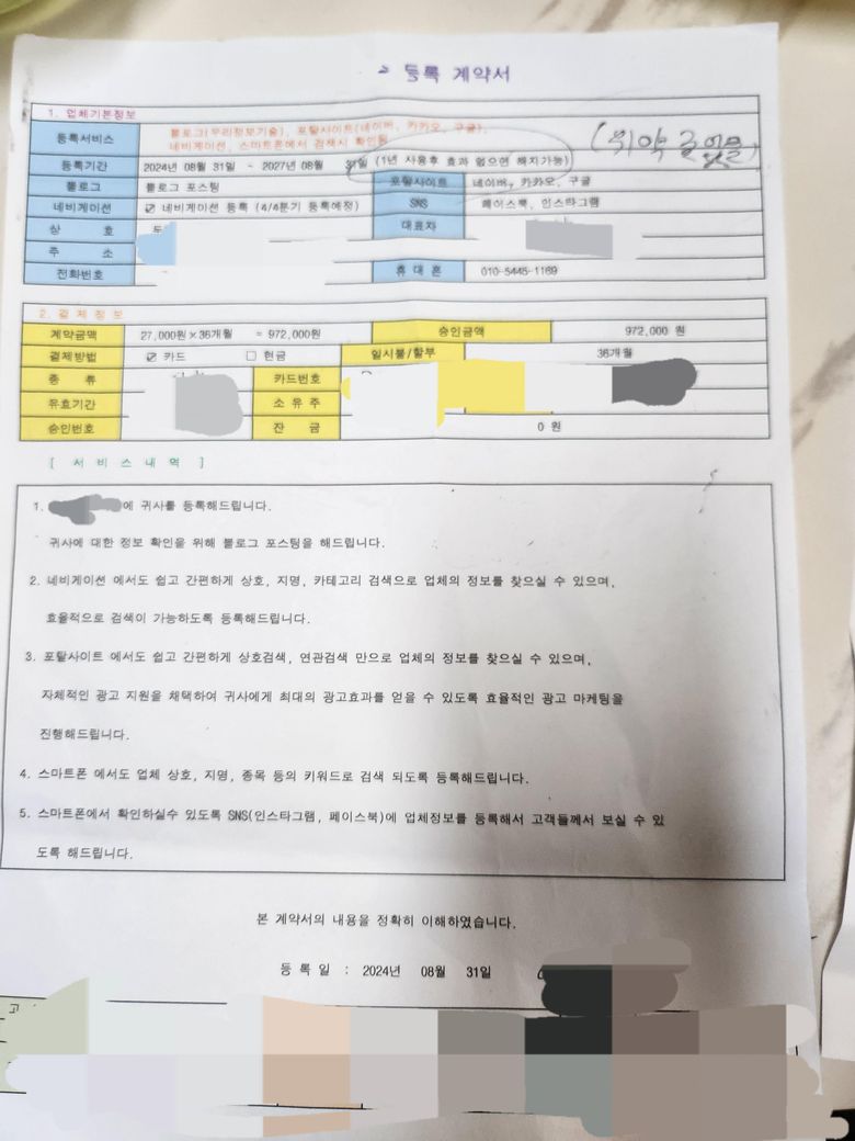 계약서상 27000원 × 36개월 = 972,000원을 카드할부로 하기로 되어있는데요.
