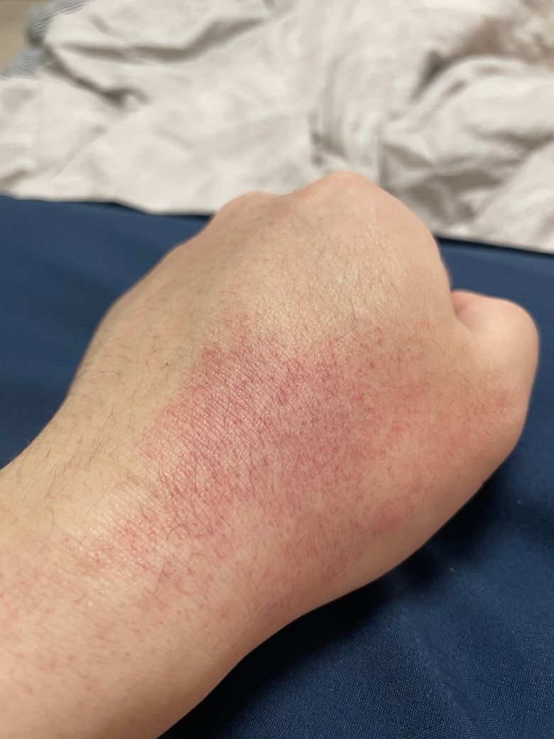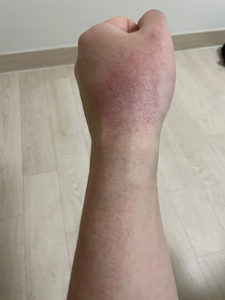 올려주신 사진과 내용으로 미루어 강한 압박으로 인한 혈액순환 장애로 인한 저림증과 피하 점상 출혈의 가능성이 생각됩니다.