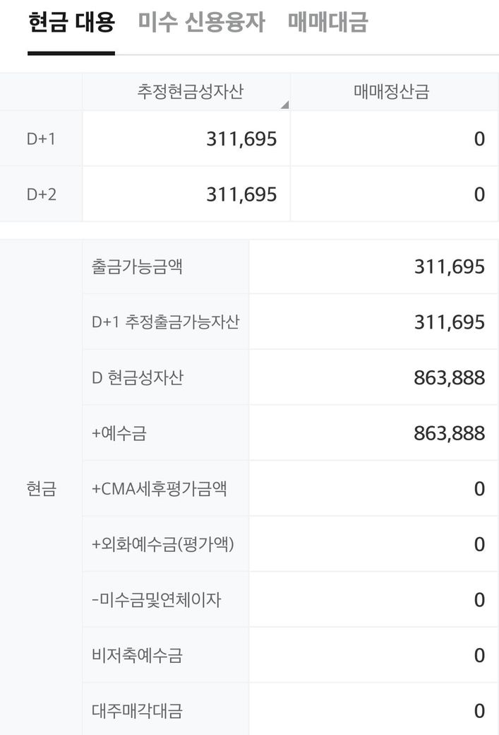 예수금과 이체가능금액이 다른 이유는 계좌 내 자금 중 일부가 다양한 사유로 묶여 있기 때문입니다. 증권사에서는 결제 대기 중인 금액이나 미체결 주문, 수수료, 담보 설정 등으로 일부 금액을 일시적으로 사용할 수 없게 묶어둘 수 있습니다. 대출 없이 주식 거래를 하지 않는 상태라도, 예수금 일부가 마감 후 결제나 내부 처리 과정에서 일정 기간 묶일 수 있어 이체 가능한 금액보다 적게 나타나는 경우가 흔합니다. 특히 주식 손실이 나더라도 계좌 내 예수금은 보유 자산과 별개로 일정 시점까지 결제나 처리가 완료되어야 자유롭게 사용할 수 있으니 너무 걱정하지 않으셔도 됩니다