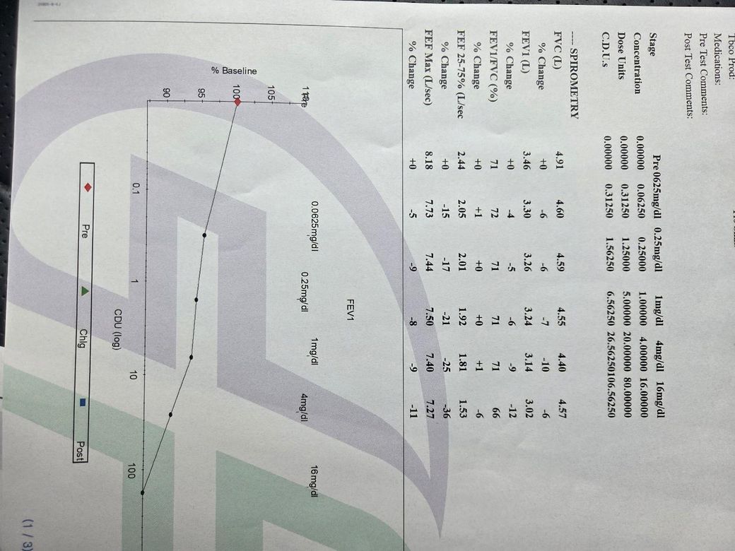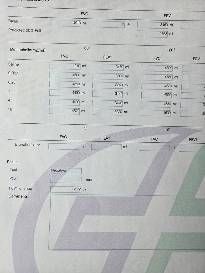 올려주신 검사지로 미루어 천식 유발 검사 마지막 단계에서 양성으로 과민성이 확인되어 경미한 천식의 가능성이 생각됩니다.