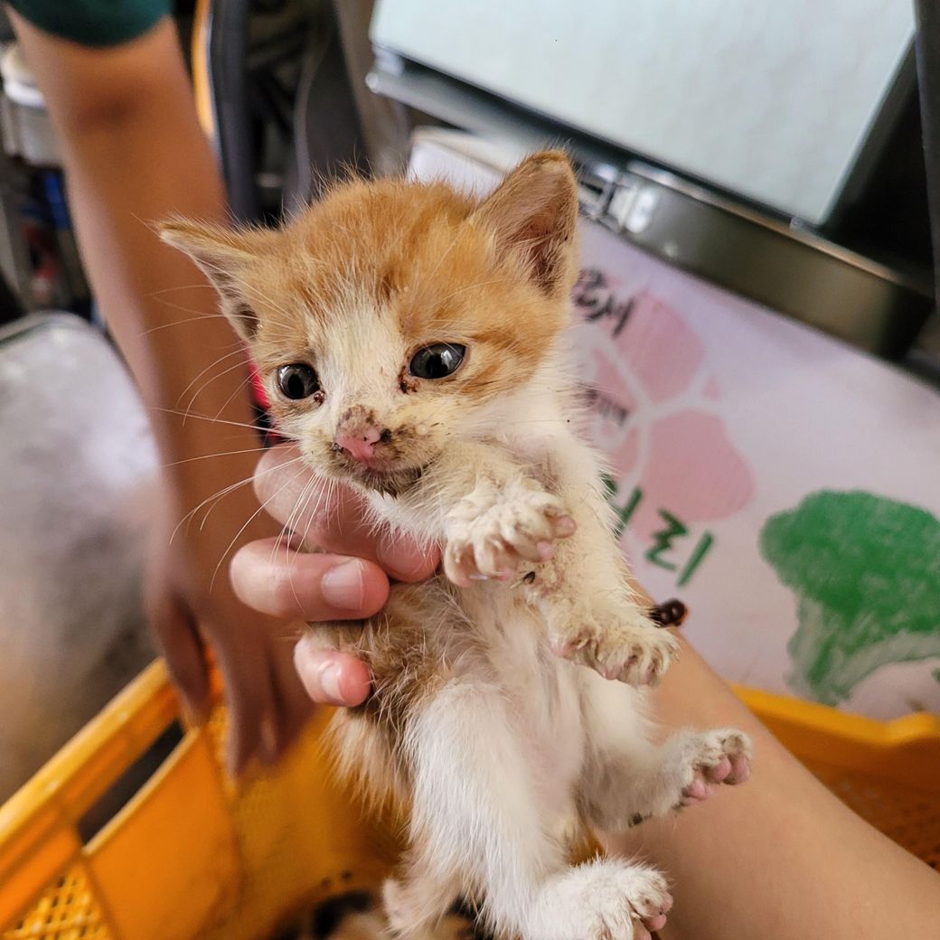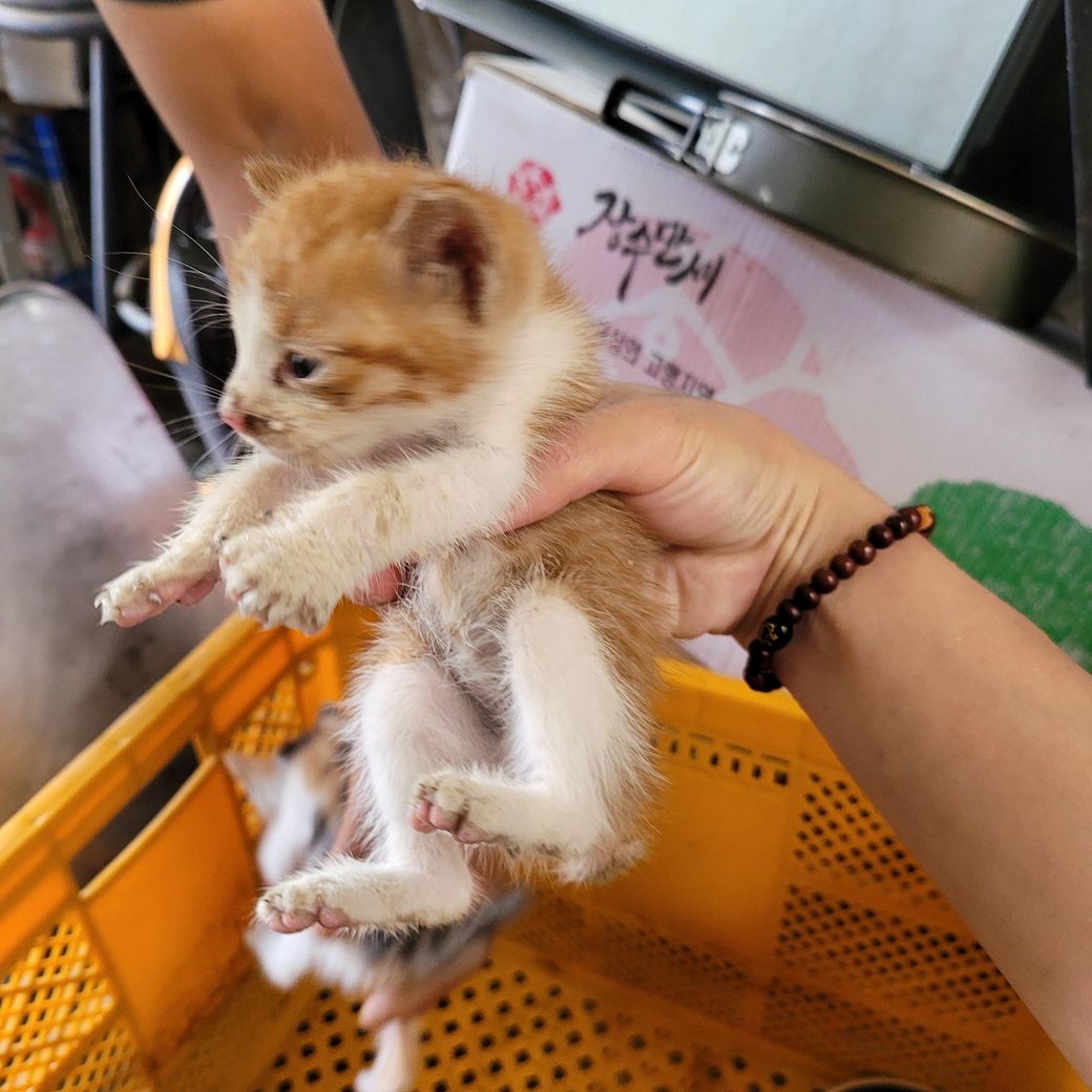 정확히는 알 수 없겠으나 사진상으로 보았을 때 한 2주일 정도 된거 같습니다 아직까지 완전히 갓난 아기 고양이인 거 같아요 그리고 사람 손을 탔다면 어미 고양이가 새끼를 돌보지 않을 가능성이 있습니다