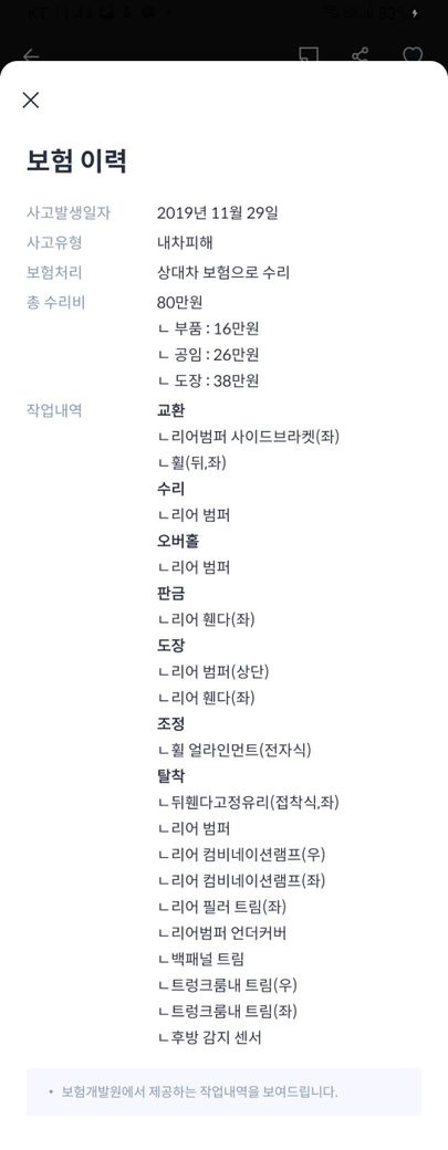 리어휀다 수리는 조심하라는 얘기 들었는데 단순수리인지 사고이력이 있는건지 모르겠어요