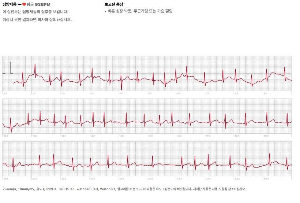 스마트워치의 심전도 기록은 단일유도이기에 위양성이 가능하고 해석에 주의를 요합니다.