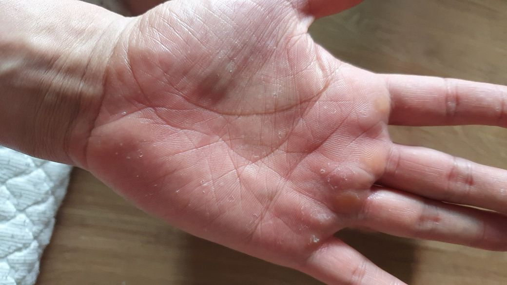 현재사진으롭하서는 발바닥과 손바닥의 무좀처럼 보입니다. 가까운 피부과 진료를 통하여 무좀이 맞다면 그에 맞는 치료를 하시는것이 가장좋겠습니다. 무좀은 치료가오래걸리므로 끈기를 가지고 치료를 하시길바랍니다.