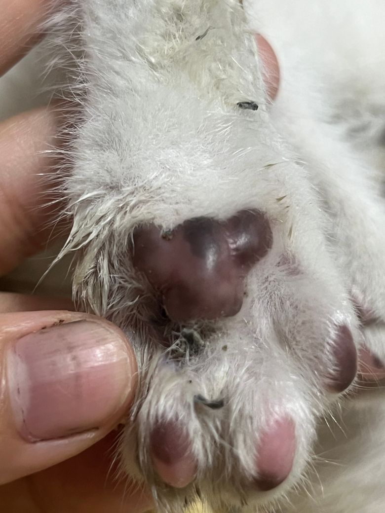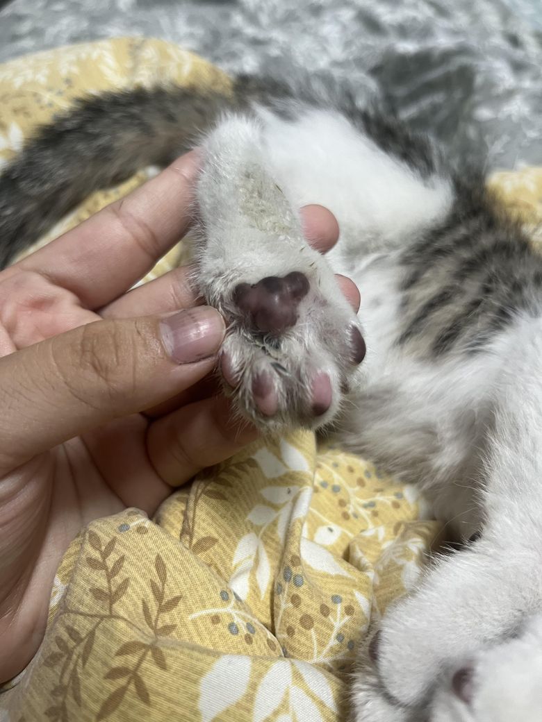 아기 고양이 뒷다리 한쪽 발바닥에만 이렇게 털이 뭉쳐있고 더러워져있어요? 약간 끈적거려서 안떨어지네요ㅠㅠ 피부염같은거 일까요…?