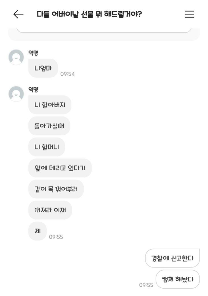 "니 엄마" "니 할아버지 돌아가실때 니 할머니 앞에 데리고 있다가 같이 목 꺾어부러 꺼져라 이제"