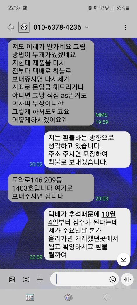 입니다. 원할하게 이해하시라고 대화내용(문자)를 번호 가린후에 올려드립니다. 한번 보시고 판단 부탁드리겠습니다.