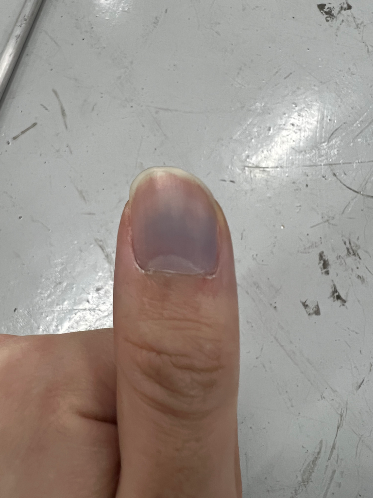 아마도 손톱으로 미시는 상황에서 손톱하부에 일부 출혈로 인한 색변화로 생각됩니다.