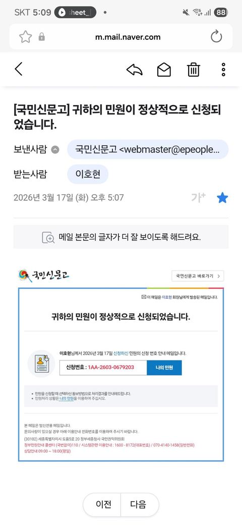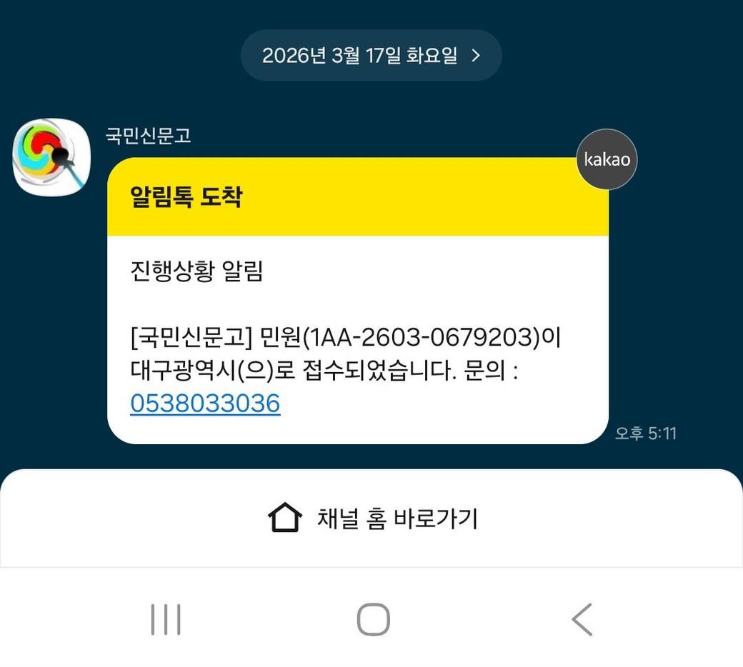 그저께 26/03/17(화) 17:08분경 국민신문고를