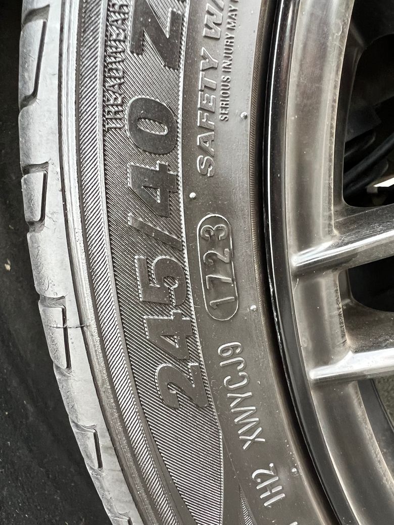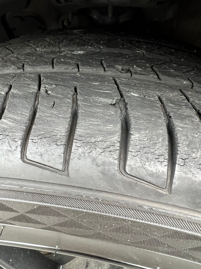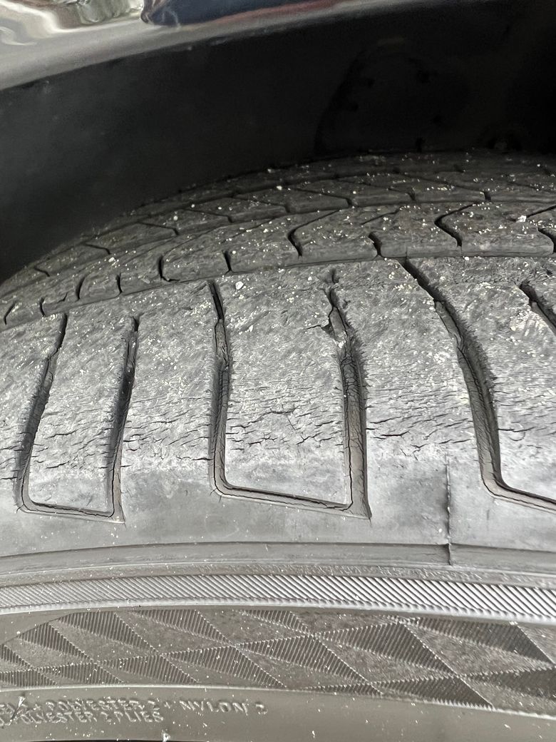 타이어는 타이어 쓰레드?가 얼마나 남았느냐로 보통 교체주기를 알수있지만 간혹 오래된 타이어들은 저렇게 고무층이 갈라지며 균열이 일어나는데요.