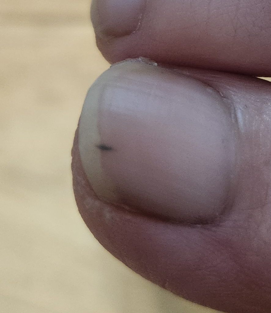 외상에 의한 조갑하 출혈일 가능성이 높습니다. 피가 고인 거라서 더 커지지는 않고 시간이 지나면서 흡수될 겁니다.