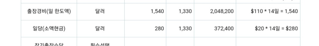 위와 같이 출장기간에 하루 $110 을 배정받는데, 현금으로 주어지거나 월급에 따로 나오는것이 아닌 하루 $110 안에서 출장경비를 쓰면 되는 구조입니다. (예를 들어 제가 식사로 $50을 쓰면 잔여 $60이 환급되는게 아닙니다). 현금으로 주어지는 출장비는 그 아래 항목의 '일당(소액현금) $20입니다. 해당 금액은 현금으로 지급받습니다.