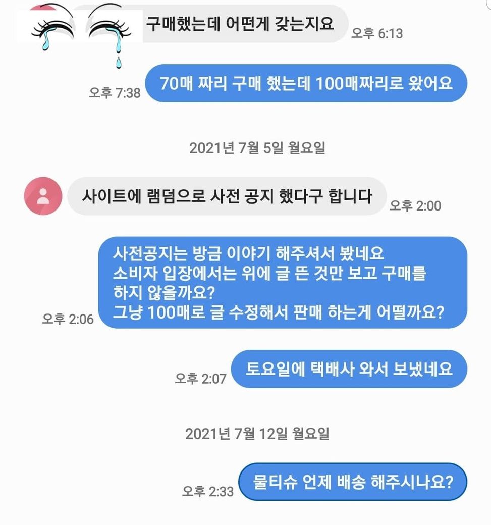 원하는 제품이 오지 않아서 판매자가 실수로 잘못 보낸거로 생각을 하고 판매자에게 '제품 잘못 보내셨네요 70매 짜리로 교환해주세요' 글을 쓰고 쇼핑몰에 교환(금)을 요청했습니다.
