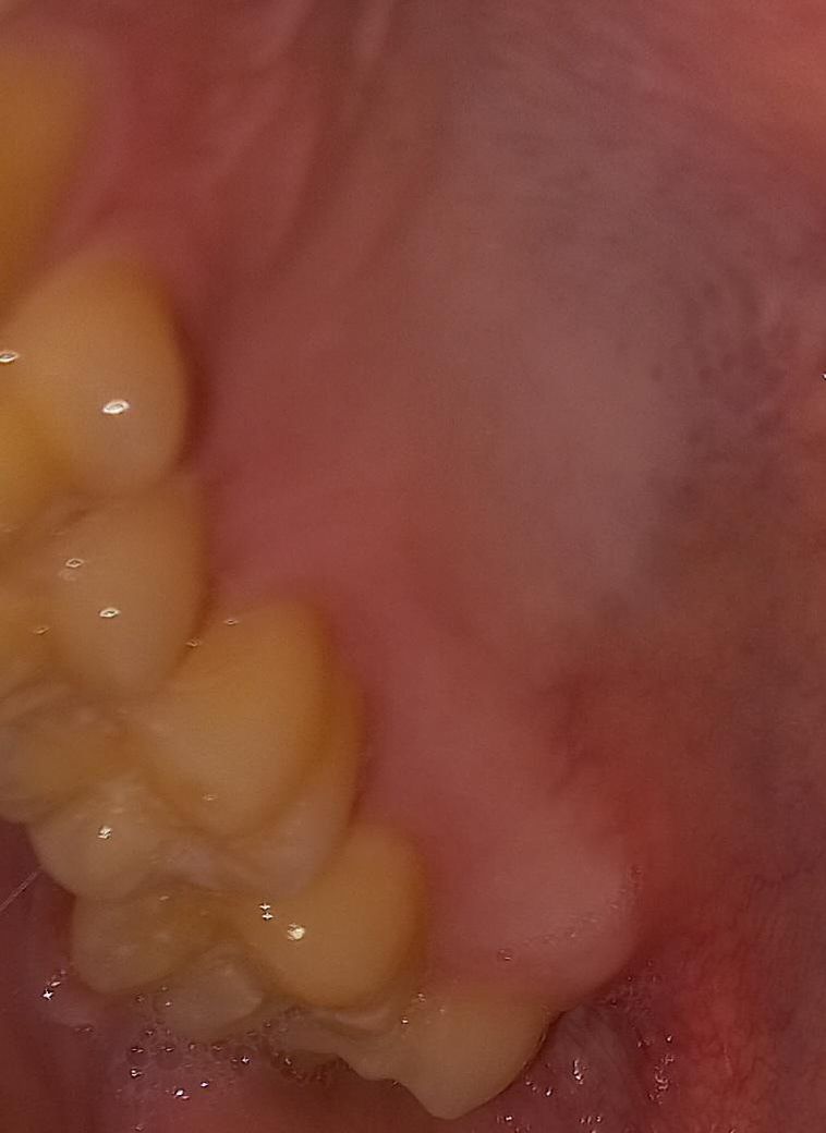 사진에서 보이는 그대로 잇몸이 과할정도로 하얗습니다. 이 상황에서 딱히 느껴지는 통증은 없습니다. 특이증상으로는 입안에서 자꾸 하얗고 투명한 액체가 발견된다는 것인데 양쪽 윗 어금니에서 나오는 거 아닌가란 생각이 듭니다.