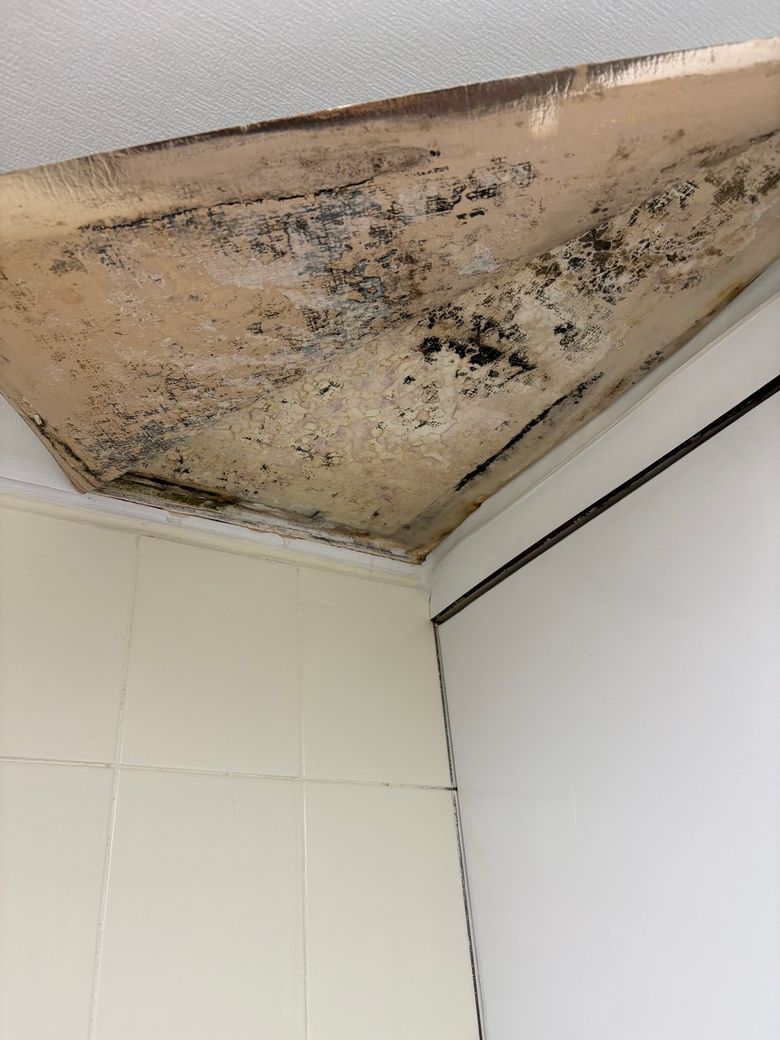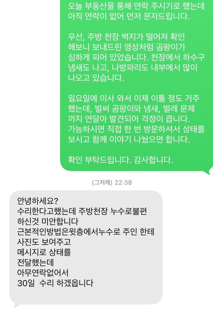 27일 천장이 축축해서 부엌쪽 천장의 보수한 시트지가 떨어졌습니다. 그 후 천장에서 엄청나게 많은 곰팡이와 벌레들이 그안에서 나왔습니다 냄새(하수구냄새)도 매우심하구요.