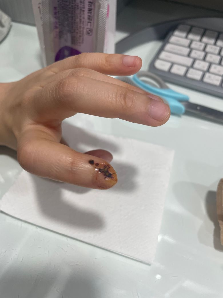 면도날에 손톱과 손톱 옆의 살이 잘려나가서 봉합 수술을 했습니다!