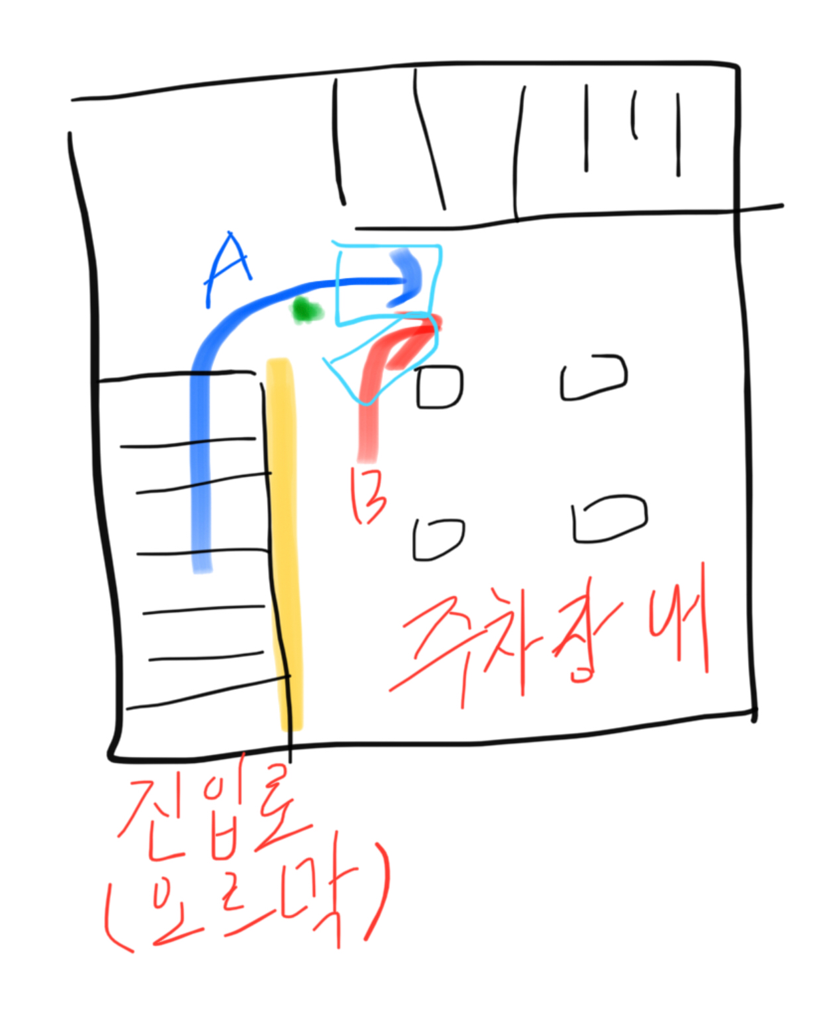 우측에 벽(노란색부분)이있기에 차량이 이동하는지 더욱 보이지 않으며