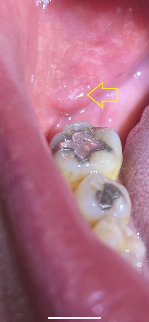 사진에 보이는 하얀색은 점막에 상처로 인해서 감염이 된 구내염을 보입니다.