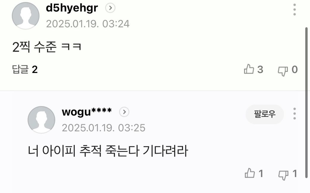 실제 서부지법 폭동에 대해 2찍 수준이라고 달았고 그 후 제 아이피를 추적 죽는다 기다려라 라는