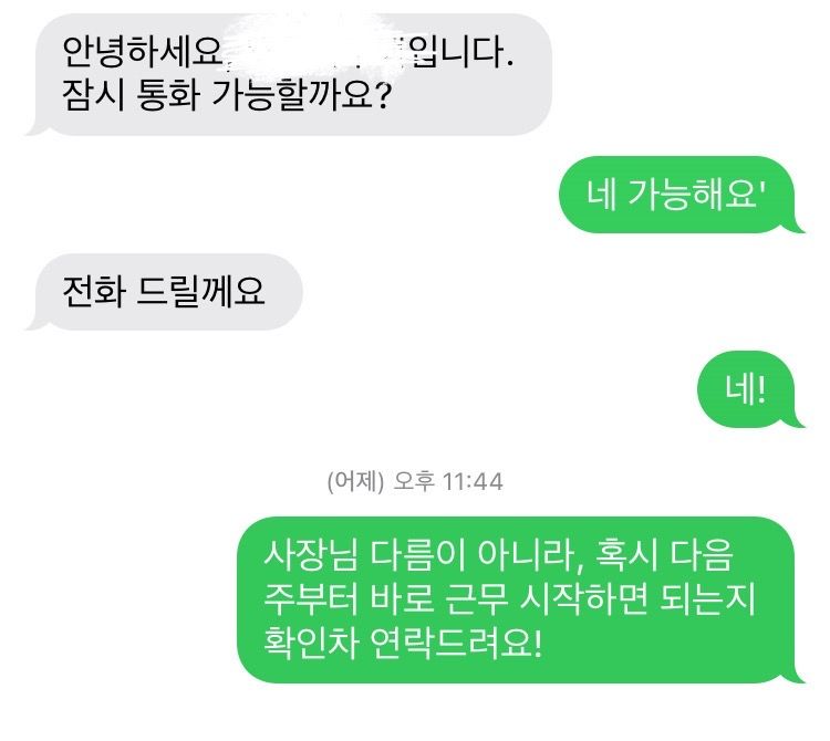 어제 새로운 알바 교육을 마쳤고, 교육이 끝난 후 사장님께 “다음 주부터 바로 근무 시작하면 될까요?“라고 여쭤봤는데 아직까지 답장이 없습니다.어제