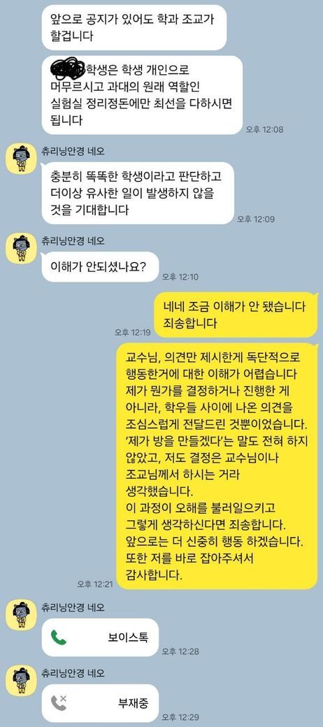 교수님의 말도 이해가 되지만 이 상황들을 제 주변인들에게 보여주면 이건 교수로의 태도가 아니라 "내가 권위적인 지휘를 갖고있으니 너는 내 말에만 복종해라 라는 말로 밖에 안 보이고 너를 갑질하고 있고 이건 너를 교수로서 대하는 태도가 아니다"라는 말이 많이 나오고, "교수 하면 안될거같다, 자르게 해야 될 정도다" 라는 주변인들의 말이 많더라고요 변호사분들 법쪽분들께선 어떻게 생각하시며