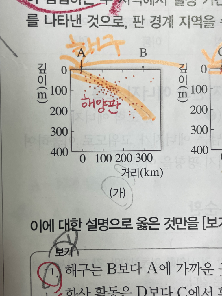 위의 사진 (가) 그림에서 a와 b중 화산활동이 더 활발한 곳은 어디이고 어떻게 찾는건지,이유가 무엇인지 알려주세요..!!!