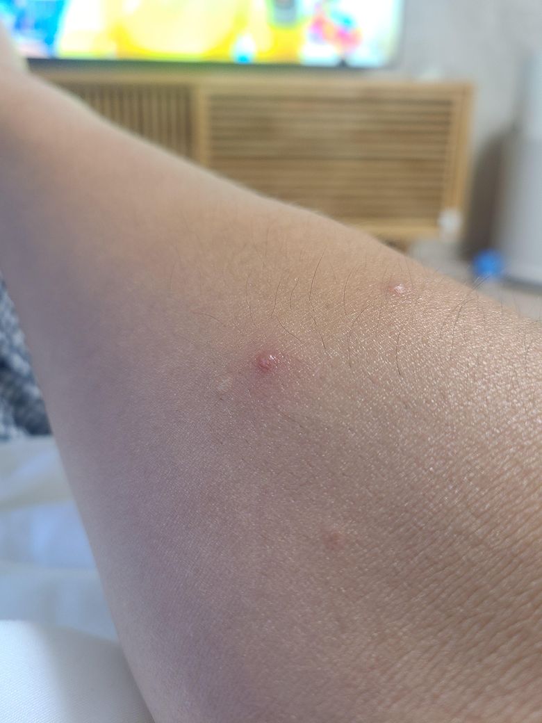 아래 사진을 올려드립니다 일주일 전부터 팔에 2군데 약간 묠록하게 올라왔고 물집같기도 하고 집에서 그냥 터트려도 되나요? 피부과를 가봐야하나요?