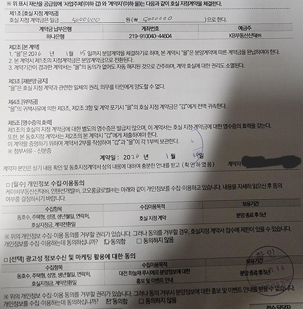 동호지정 계약서 작성하고 500만원 입금했는데 환불 가능한가요? 계약서 사진도 올려드립니다. 확인 하시고 답변 부탁드립니다!