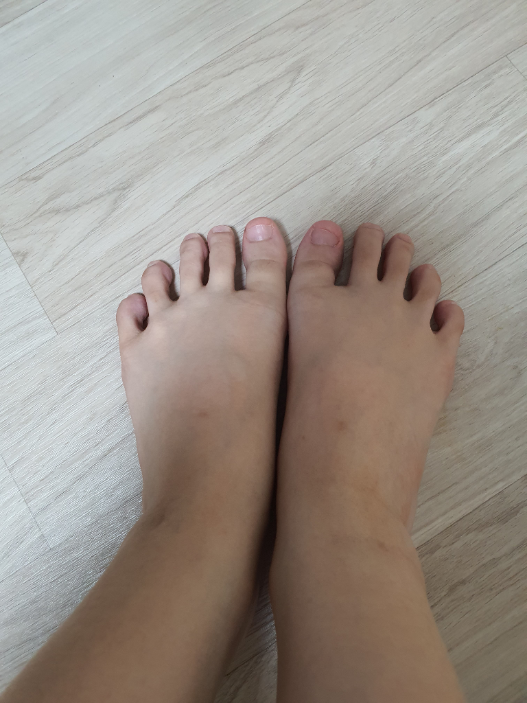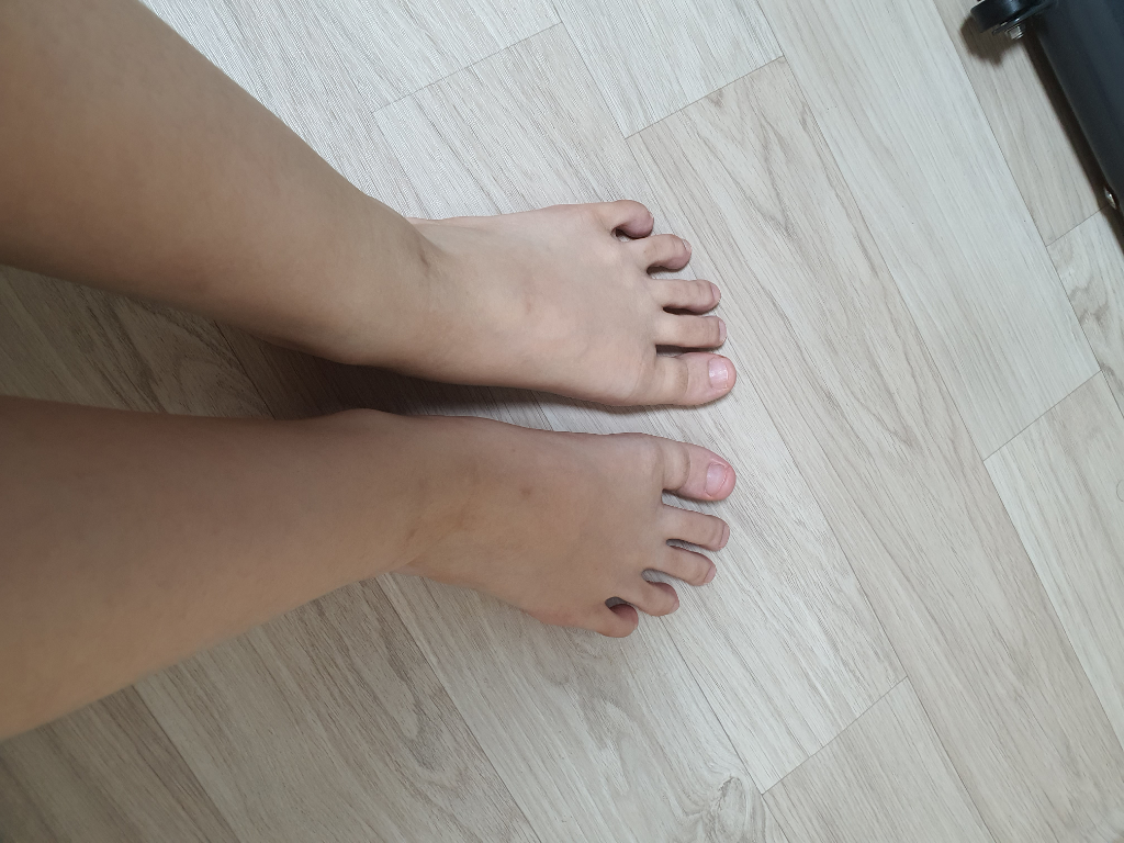 우측 발가락이 안쪽으로 휘어 있네요. 아프지 않은 경우라면 더 심해지지 않도록 조이는 신발을 신지 않고 다니는 것이 중요합니다. 교정은 정형외과에 가보셔야 하구요.