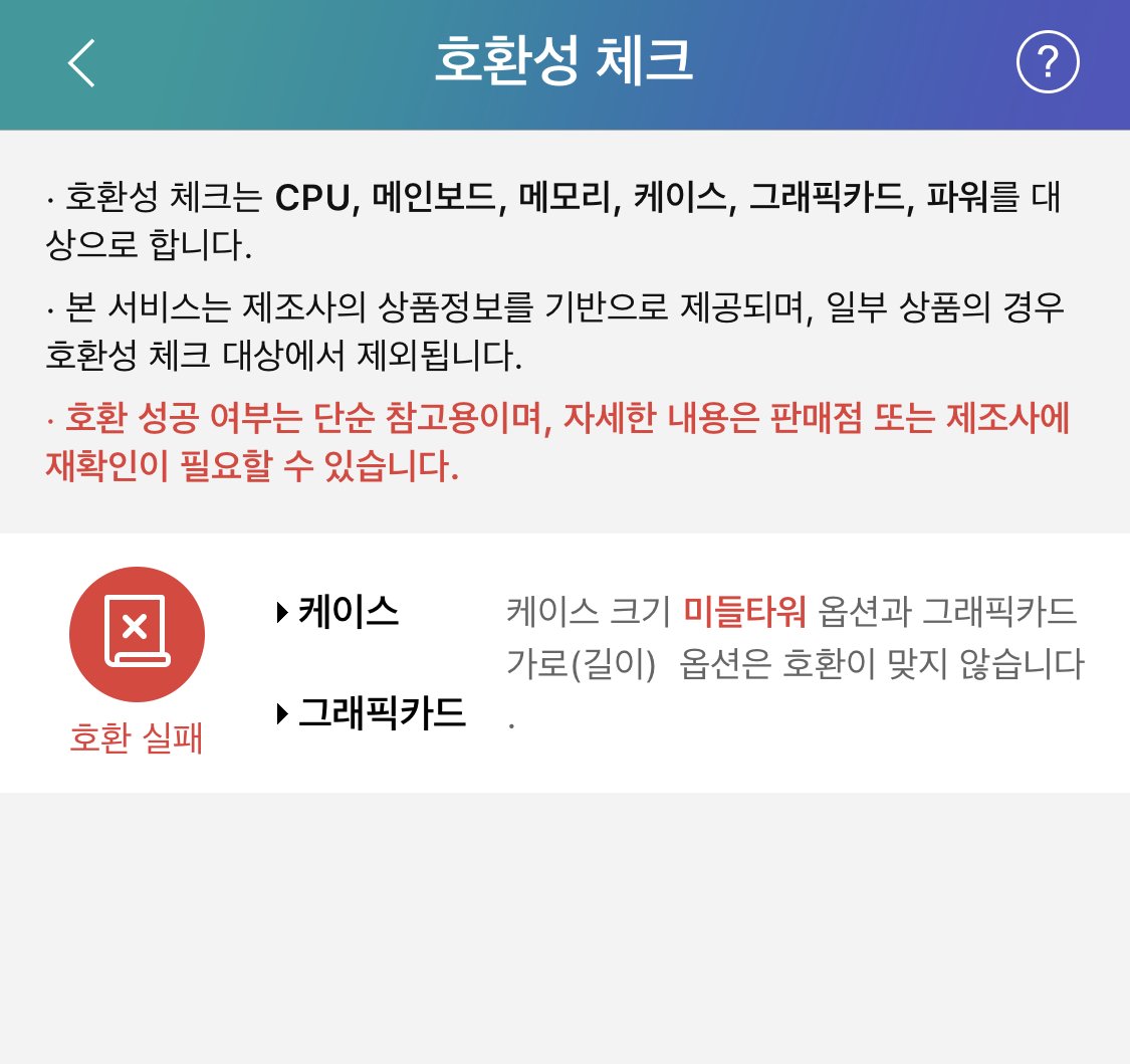 다나와에서 호환성체크해보니까 무조건 정확하다고 할순 없지만 케이스랑 그래픽카드가 호환이 되지않는다고 나오네요