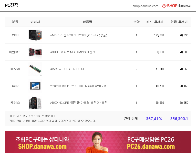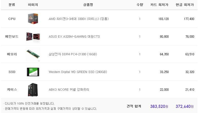 cpu 나 메인보드 , 메모리 케이스는 크게 문제가 없을거 같고 ssd만 용량을 잘 생각하여 구매하시면 될거같습니다 본인이 마추시는게 아니라면 공인비 까지 생각하시구요 그럼 참고만 하셔서 좋은 컴 마추시면 좋을거 같습니다!.