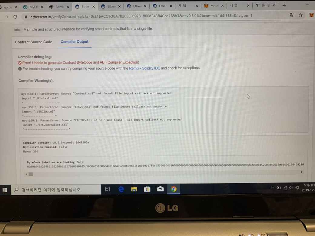 리믹스와 메타마스크를 이용하여 erc20 토큰을 만들었습니다. 제가 만든 토큰을 이더스캔에 소스코드를 게시 하려고하는데 .. 사용했던 솔리디티 컴파일러 버전과 리믹스에서 소스코드를 넣었는데 자꾸 오류가 나옵니다 분명 리믹스에 있는 소스코드 erc20.sol을 그대로 복사해서 붙여넣고 Verify and Publish 를 눌러도 오류가 나오면서 안됩니다.. 아래 사진 첨부드리니 혹시 방법을 아시는분좀 알려주세요 부탁드려요