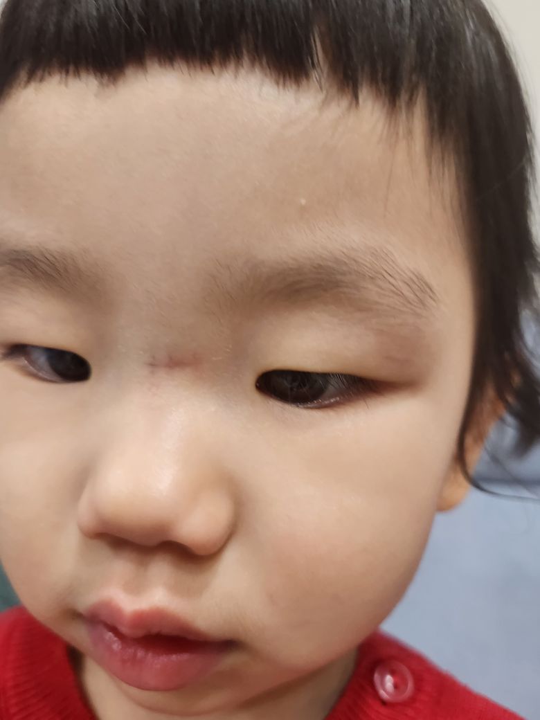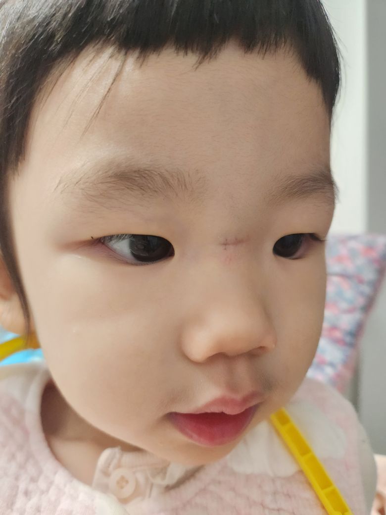 아이의 봉합사는 모두 제거된 상태이고 상처는 깨끗합니다. 영구적인 흉터로 남을지는 더 지켜보아야 하겠지만 현재 보이는 것은 상처로 인한 흉터뿐입니다.