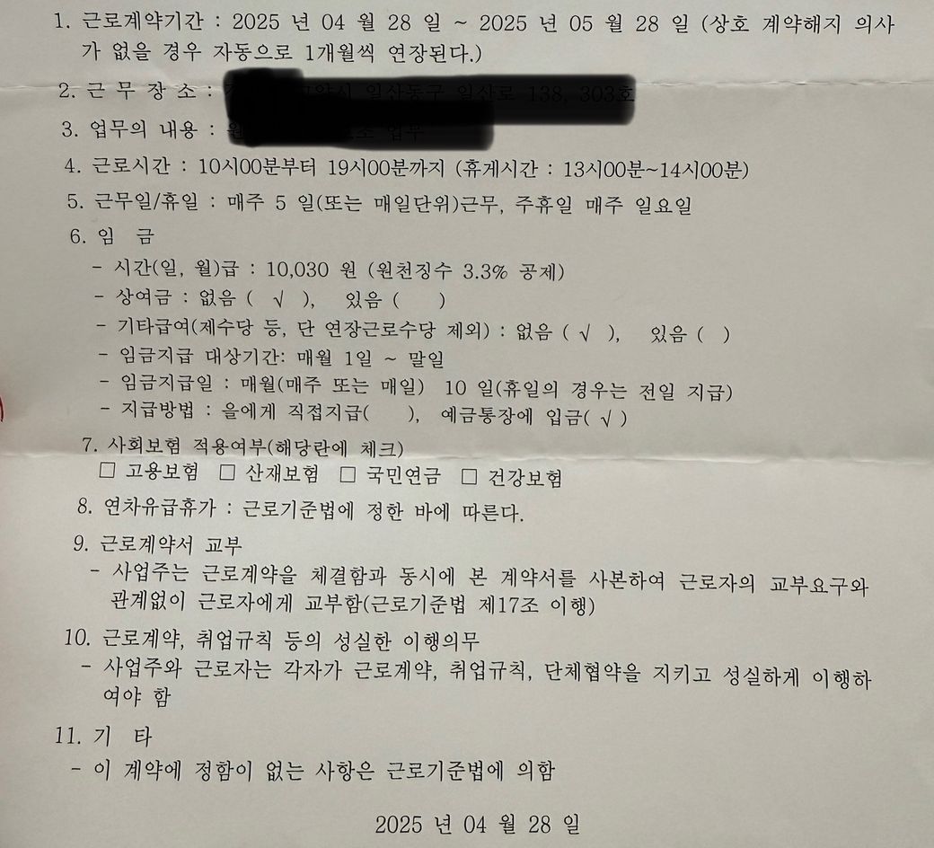 근로계약서에는 기간이 6개월이라는 기간이 명확하지 않은 점과 4대보험 체크란이 있지만 제가 선택할 수 없었던 점이 걸립니다.