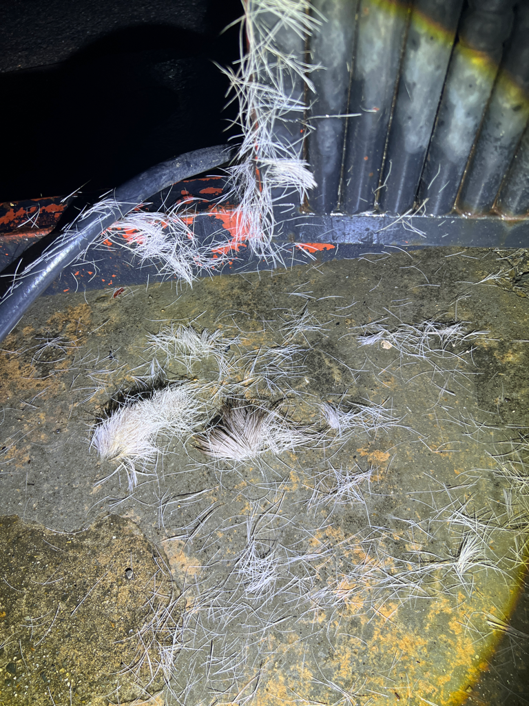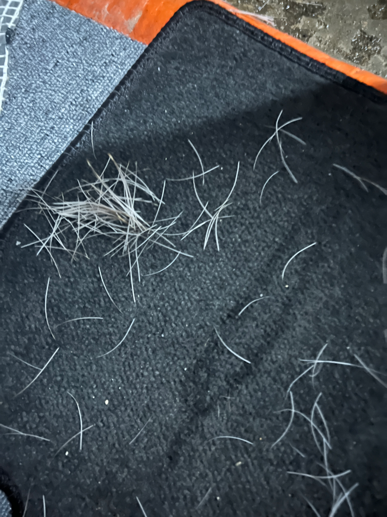 밤8시 나갔더니 털같은게 여러개있습니다 하얀색에서 끝에는 갈색으로 끝나네요 털이 한번에 뜯긴걸로 보니 영 수상합니다 주위에 산이 있긴한데 여기까지올까요? 털이 이정도로 뜯긴거라면 습격을 당한걸까요? 만지니 부드러운 소나무잎 느낌입니다