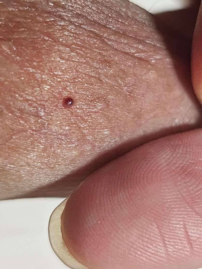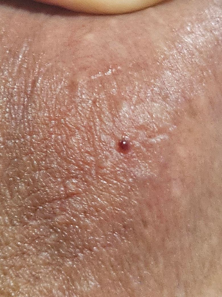 다만 크기가 커지거나 색이 짙어짐, 출혈 반복, 딱딱하게 만져짐, 주변 피부 변화가 생기면 피부과나 비뇨의학과에서 육안 진찰을 받는 것이 안전합니다. 고환 내부 덩어리가 아니라 피부 병변으로 보이므로 과도한 걱정은 필요 없어 보입니다.