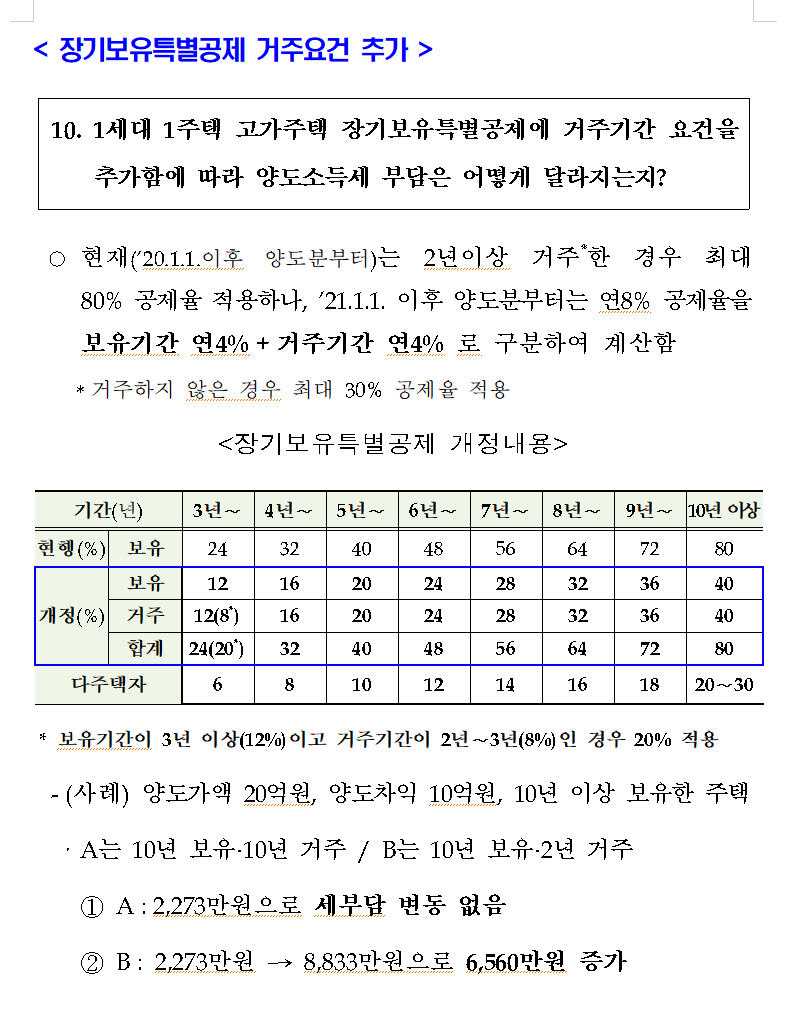 거주기간이 2년 이상이어야 하며, 거주기간에 따라서 장기보유특별공제율도 달라집니다.